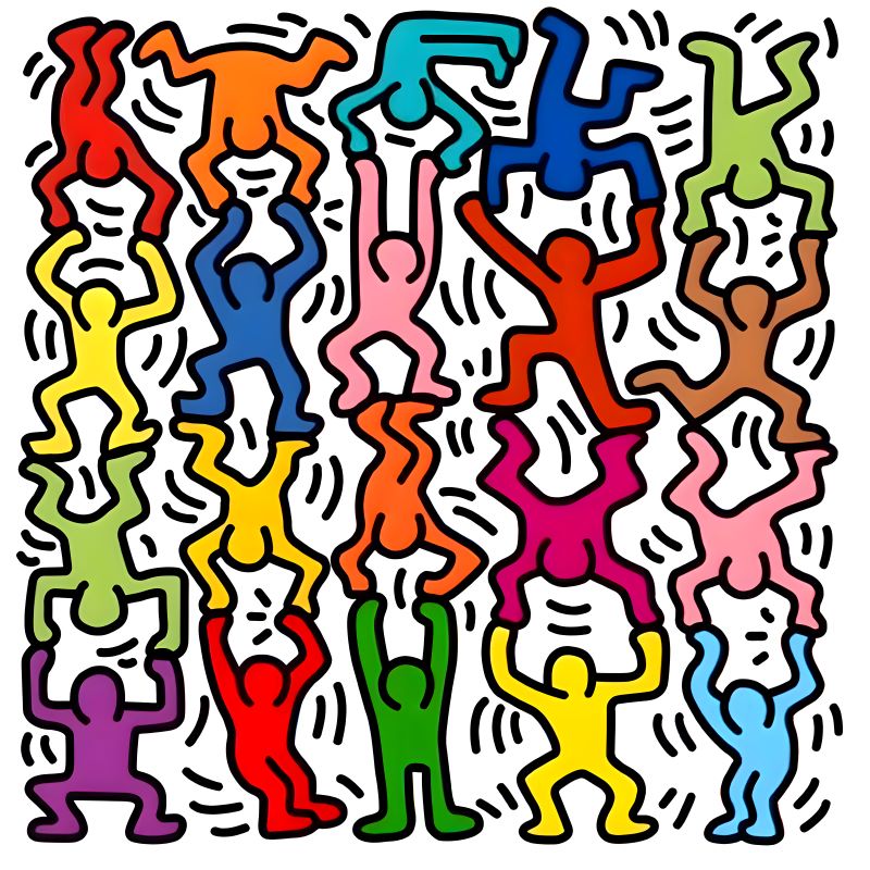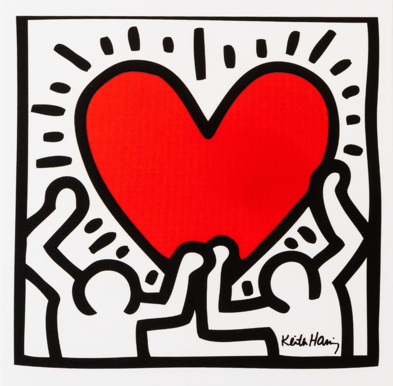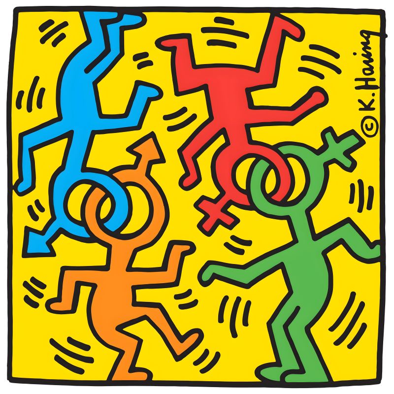 Keith Haring’s art is characterized by thick black outlines, vibrant primary colors, and animated figures. His works often convey movement, energy, and social commentary through deceptively simple imagery. Deeply rooted in street culture, his style straddled the line between graffiti and high art, making complex themes visually accessible to the public.
