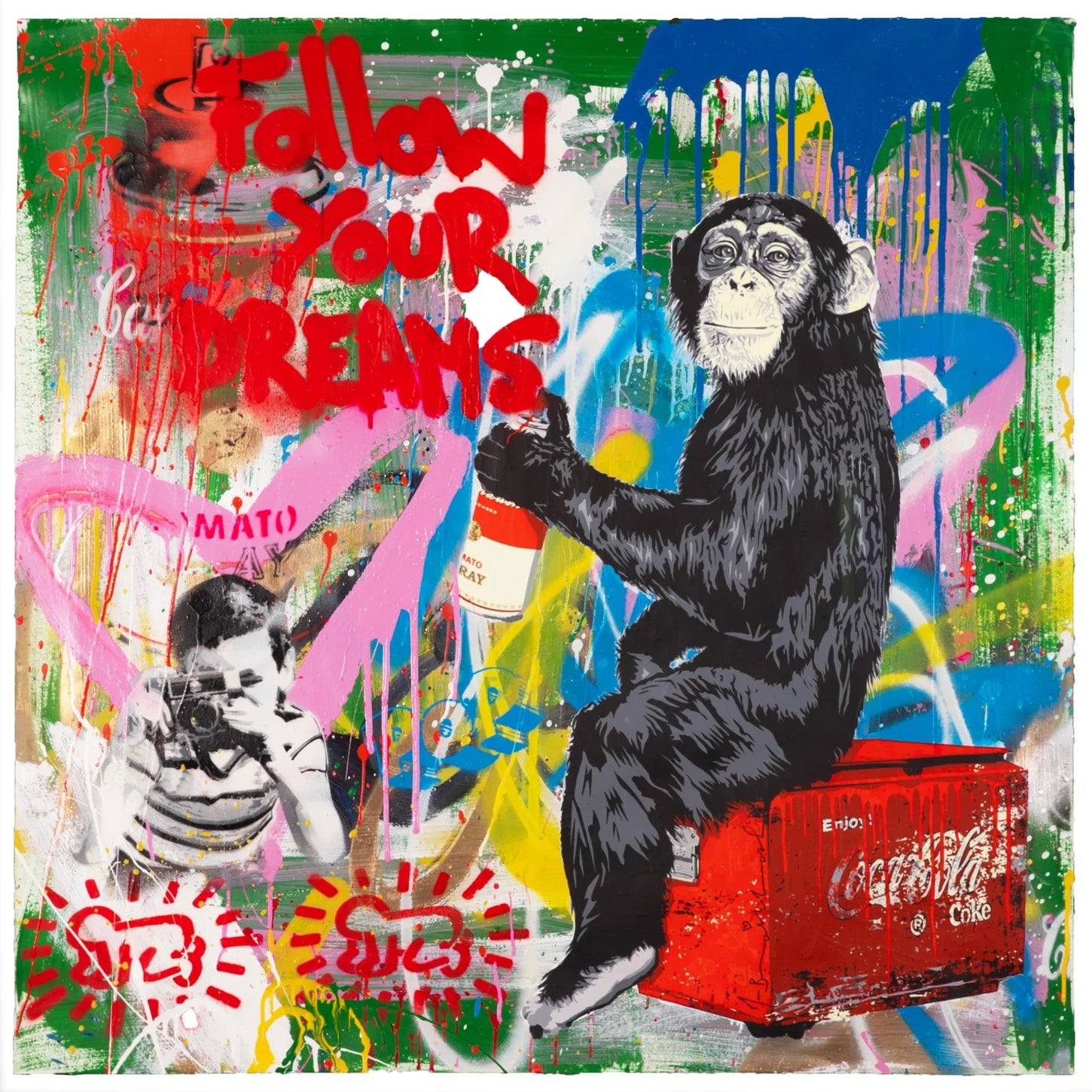 Mr. Brainwash’s style is a vibrant mash-up of Pop Art and street art, combining cultural icons, slogans, graffiti techniques, and mixed media. His approach is often maximalist, playful, and unapologetically loud — designed to evoke joy, curiosity, and mass appeal.